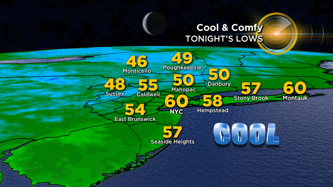 Temperatures will be running a little cooler than last night with temps bottoming out around 60° in the city. As for the suburbs, it will be on the chilly side in the 50s and 40s.