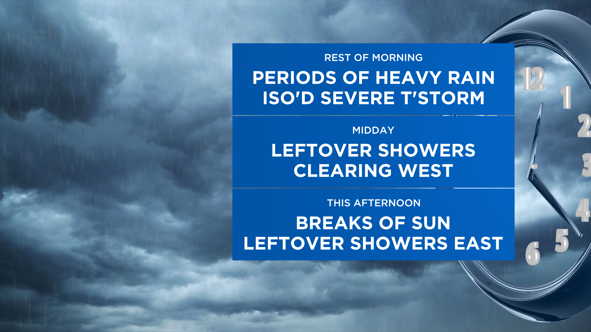 Today: Blustery with periods of moderate to heavy rain through midday and the potential for an iso'd severe t'storm (damaging winds) and localized flooding. Rainfall amounts will be .5-1.5" on average with locally up to 2" possible. For the remainder of the day, expect leftover showers/t'storms -- but mainly to the east -- with partial clearing behind the cold front. Highs will be in the 60s.