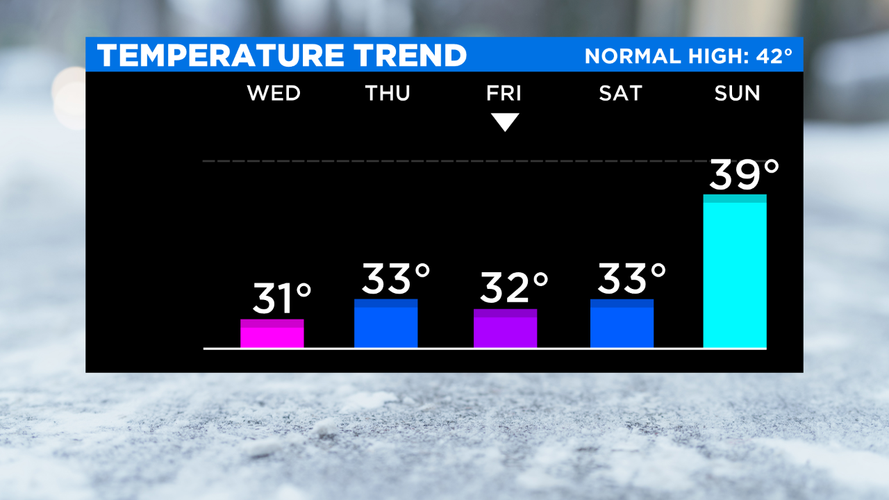 Sunday's our next chance to see some snow (N&W)/rain showers push through... little or no accumulation expected. It will be slightly warmer with highs in the upper 30s.