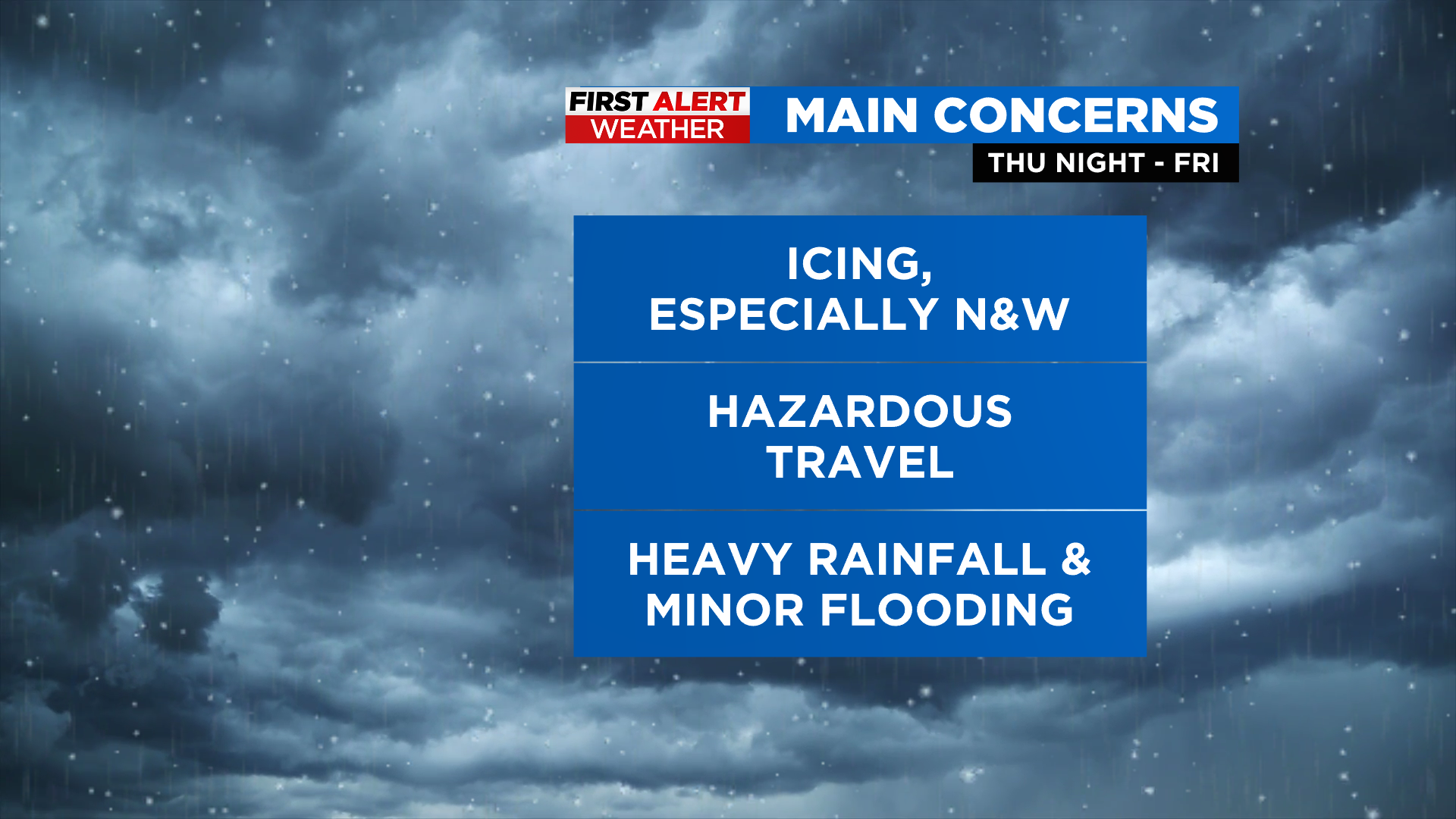 Tomorrow night into Friday: Rain changes to a wintry mix N&W overnight... potentially changing to a wintry mix closer to the city in the morning or afternoon on Friday. The main concern is freezing rain (icing), especially N&W, that could lead to hazardous travel and potentially some other issues.