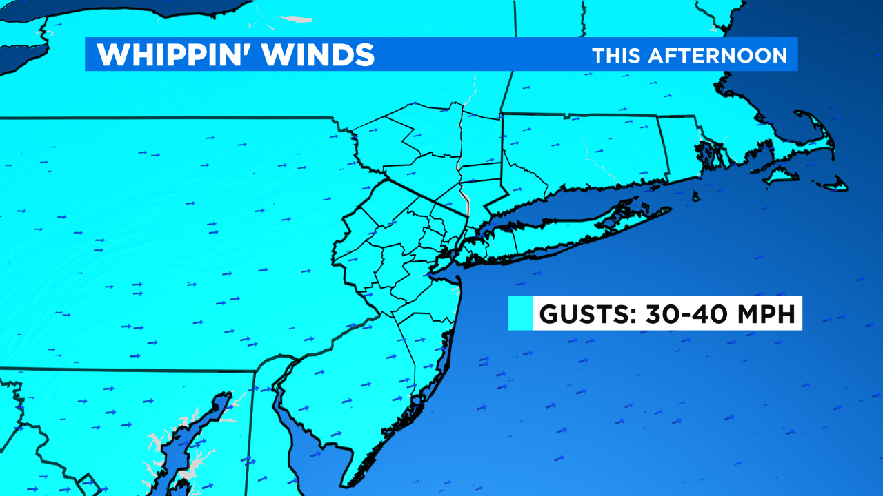 This morning's rain is gone and we're left with brighter skies and gusty winds. Temps will be right around 40 this afternoon, gradually falling into the 30s. With gusts of 40 mph at times, it'll be feeling more like the upper 20s and lower 30s.
