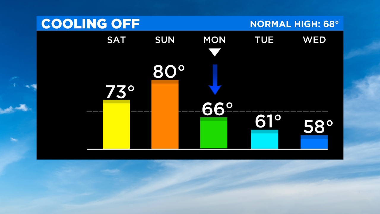 It will be a bit cooler day with increasing clouds and blustery conditions. Even a shower can't be ruled out this afternoon, but it will be dry for the most part. As for highs, they'll be in the mid to upper 60s.