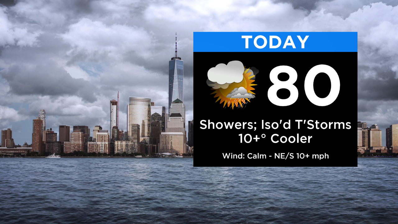 Showers will linger through the day, though the focus this afternoon will be in and around the city and southward. It will be 10+ degrees cooler, as well, with highs only around 80, marking an end to the heat wave.