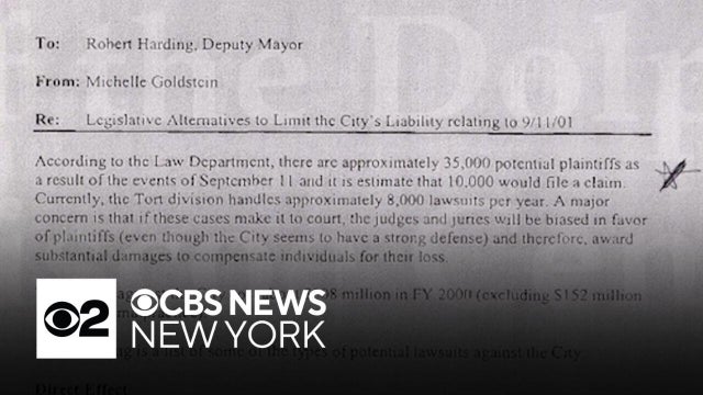 A newly released memo reportedly shows that in the month following the 9/11 attacks, New York City was preparing itself for possible lawsuits they thought could arise from claims of toxic air. Officials at the time claimed the air was safe, but we now know it was not. CBS News New York's Alice Gainer reports.