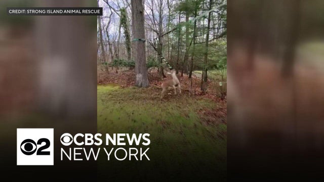 Cellphone video shows a deer getting caught in a backyard zip line in Brookhaven, Long Island.
