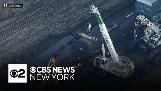 The work has been continuing to upright several freight train cars that derailed in North Bergen, N.J. Tuesday.