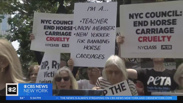Animal rights activists and elected officials are calling on New York City to pass Ryder's Law, which would ban horse carriages in Central Park and replace them with electric carriages. Read more: https://cbsloc.al/3NTK6VO