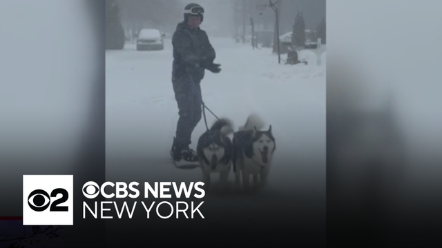 A pair of huskies pulled a New Jersey resident along the snowy road on skis during the major winter storm.