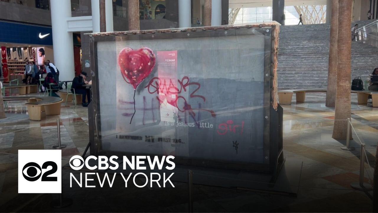 Artwork by the mysterious Banksy is now on display at Brookfield Place in Manhattan. The piece, titled "Battle to Survive a Broken Heart," will be auctioned off on May 21.
