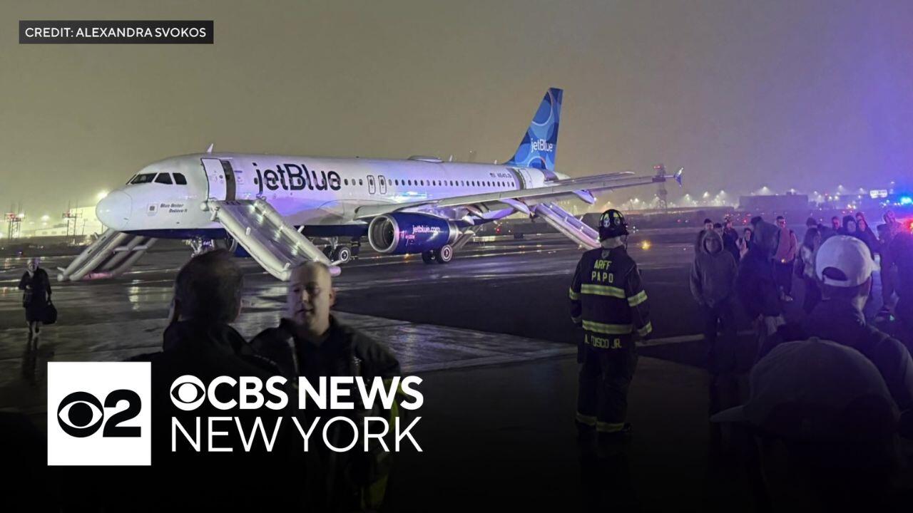 Dozens of passengers had to evacuate down the slides of a JetBlue plane Wednesday after an engine failure led to an emergency landing at Newark Airport. CBS News New York's Ali Bauman reports.