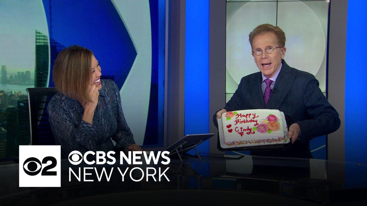 CBS News New York's John Elliott surprised Cindy Hsu with a birthday cake, although he was one day late.