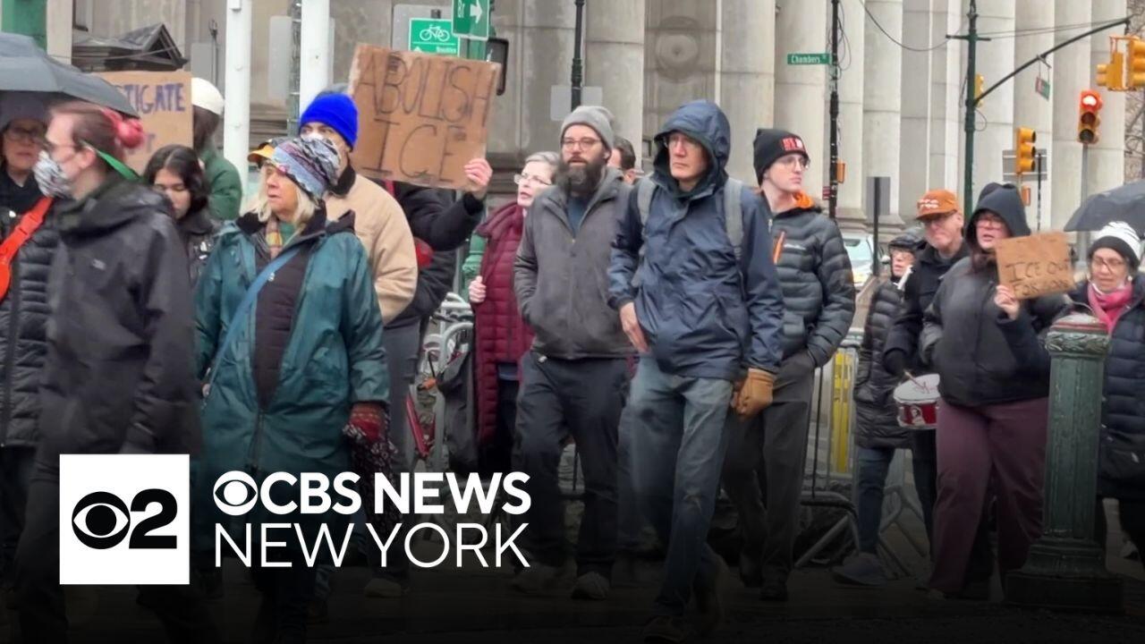 At least 100 demonstrators took to New York City's Federal Plaza in the rain Saturday afternoon to condemn the shooting of Renee Good in Minneapolis. CBS News New York's Kristie Keleshian reports.