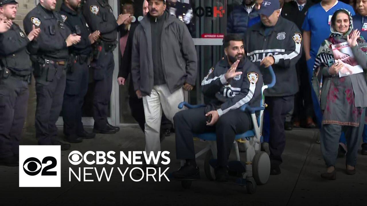 NYPD Officer Sharjeel Waris left the hospital after being struck in the face with birdshot fired by a man with a shotgun in Brooklyn Monday morning. CBS News New York's Natalie Duddridge has more on the deadly encounter.
