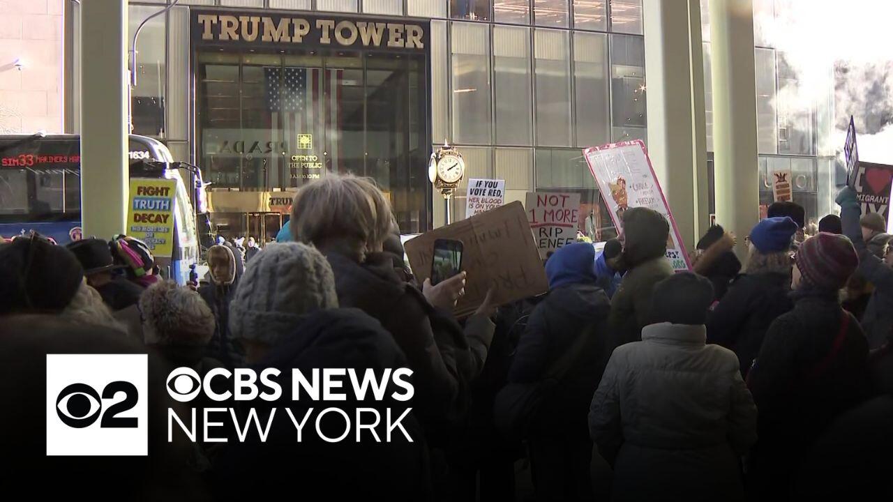 Protesters gather outside Trump Tower in NYC to mark 1st year of president's 2nd term