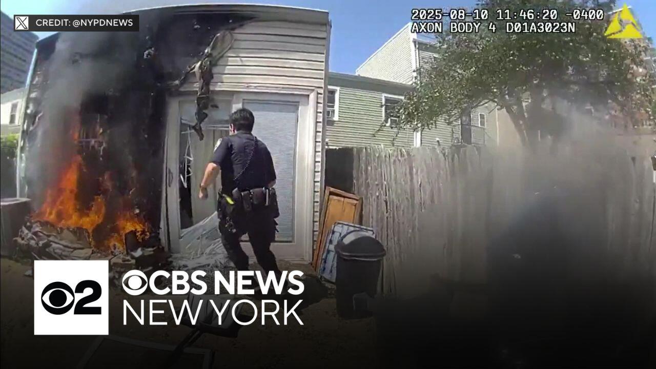 Video shows NYPD officers on Coney Island responding to a house fire and helping the residents and their pets get out safely.