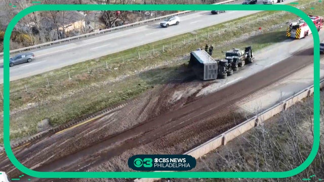 A dump truck full of manure crashed and overturned, spilling its contents onto I-78 in Lower Saucon Township, near Bethlehem, Pennsylvania State Police said. Video credit: Rich Rolen