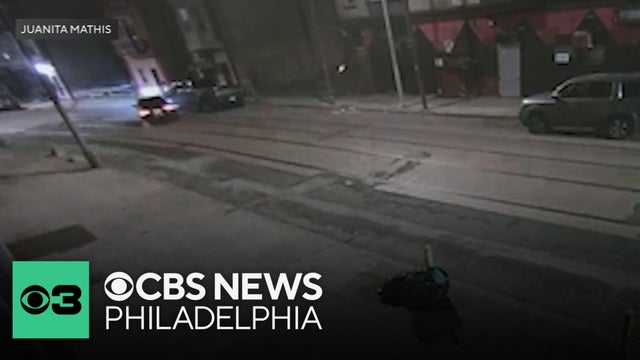 Security camera video obtained by CBS News Philadelphia shows a car speeding down the street, jumping the curb and slamming into the building.