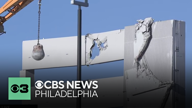 Demolition on a parking garage in Grays Ferry resumed Sunday after the structure partially collapsed last week. One construction worker was killed and two more are presumed dead, though their bodies have not yet been recovered. CBS News Philadelphia's Ray Strickland has the latest from the site.