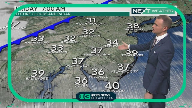 A dry cold front will slowly work through the region and usher in cooler and drier air which will send temperatures in the upper 20s Saturday morning. The coldest Philly has been so far this season is 31 degrees. Bill Kelly reports.