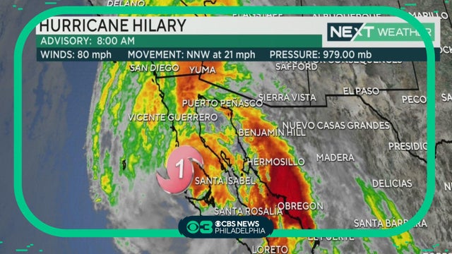 As of Saturday morning Hurricane Hilary was located approximately 225 miles south of Cabo San Lucas, Mexico. Still a large category 3 hurricane, with 125 mph winds moving north-northwest at 16 mph. Grant Gilmore reports. READ MORE: https://cbsloc.al/3QL9HmQ