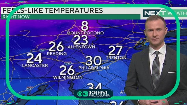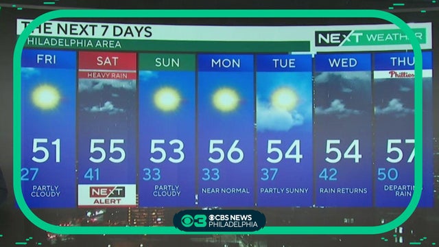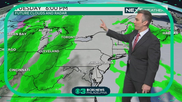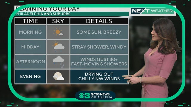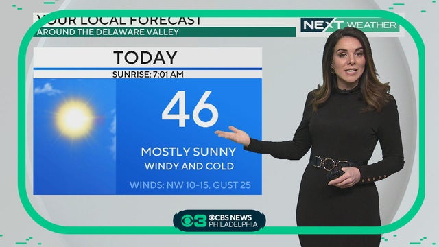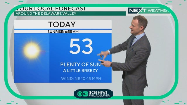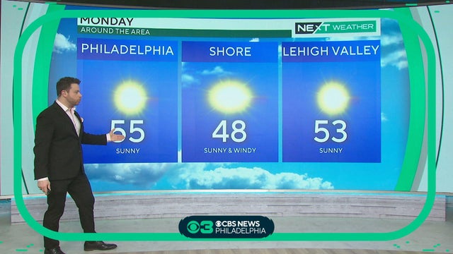 Another sunny but breezy day Monday with highs in the low 50s. Dry weather continues tomorrow before the Delaware Valley's next weather maker brings rain and clouds to the region Wednesday and Thursday.