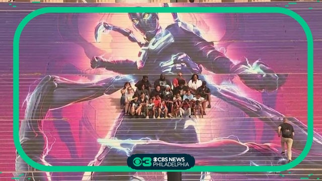 The D.C. superhero, "Blue Beetle," is now gracing the famous steps of the Philadelphia Museum of Art.