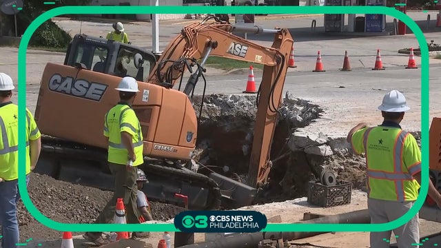 Crews are working to repair a massive sinkhole created by a water main break in the middle of the roadway between the Tires Plus and the Walgreens in King of Prussia.