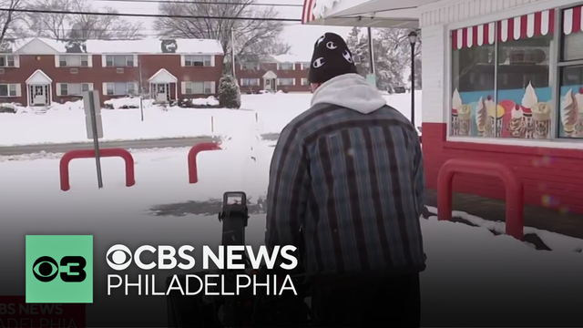 The Rita's Italian Ice location in Aston, Pennsylvania, opened for the season on Friday, and just days later owner Charlie Wojciechowski was seen blowing about a foot of snow. CBS News Philadelphia's Joe Holden was in Delaware County with a look at conditions as the storm lightens up.