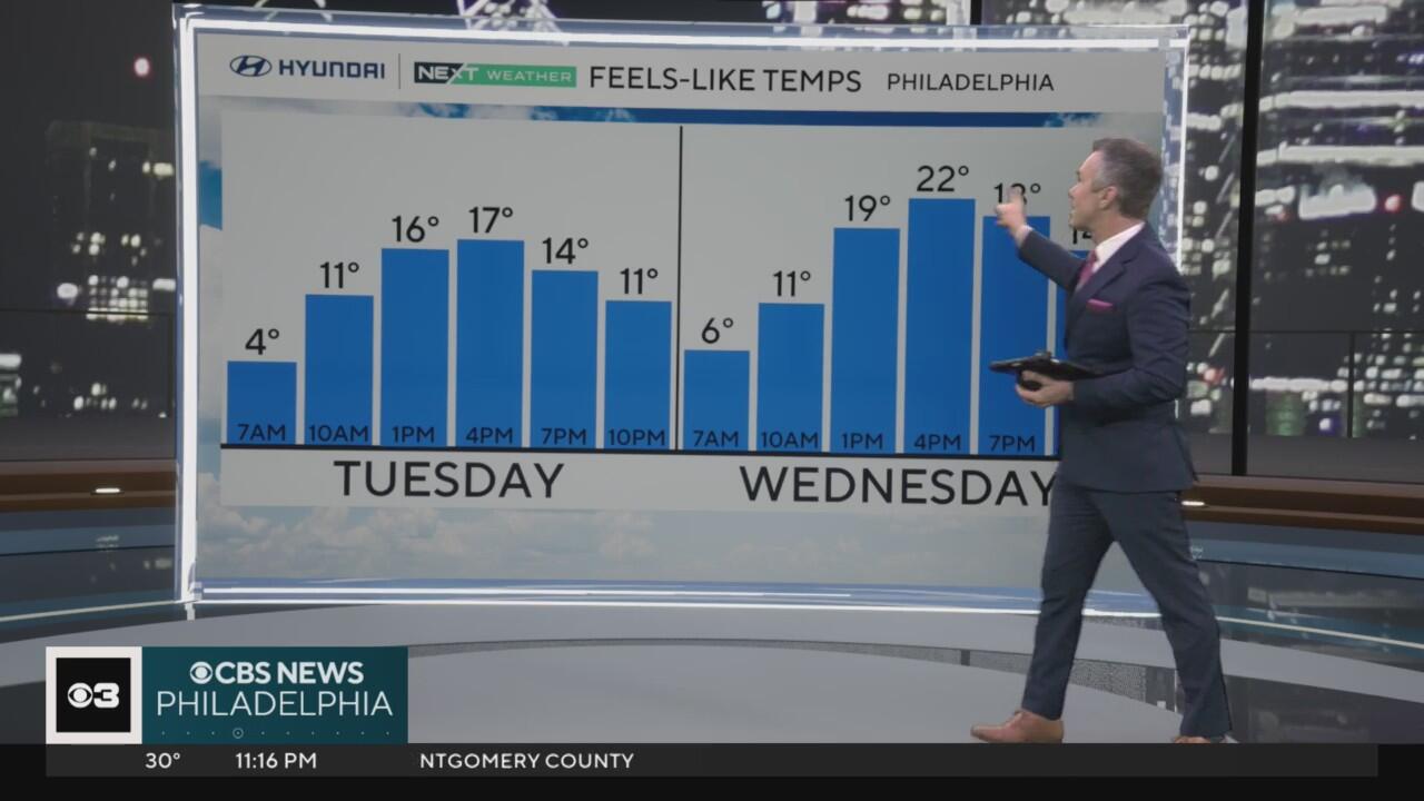 Conditions will be frigid in the Philadelphia region Tuesday and Wednesday, with feels-like temperatures below freezing throughout the day. Chief Meteorologist Bill Kelly has the forecast.
