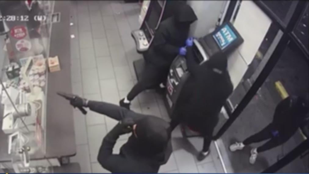 The four people were trying to rob an ATM machine in the gas station while one of them was pointing a gun at the clerk.