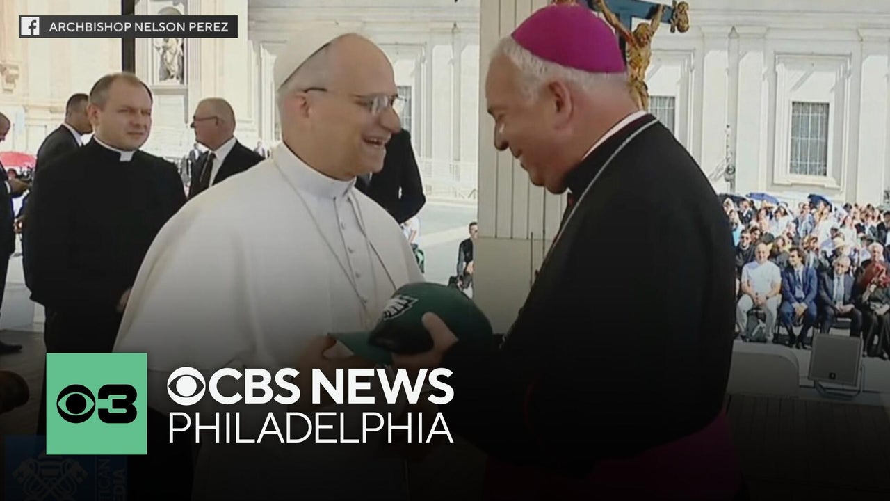 Pope Leo XIV receives an Eagles Super Bowl hat from Archbishop Nelson Pérez during meeting