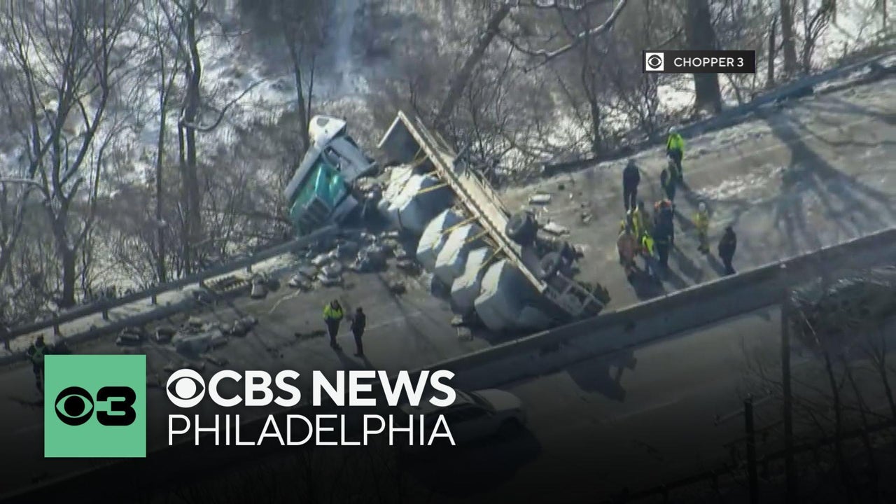 A tractor-trailer hauling concrete barrier segments overturned in a crash on Route 30 in Chester County, Pennsylvania.