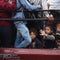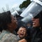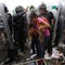 A Honduran migrant mother and child cower in fear as they are surrounded by Mexican Federal Police in riot gear, at the border crossing in Ciudad Hidalgo, Mexico, October 19, 2018.