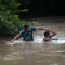 Honduran migrants attempt to cross the Goascoran River from Honduras into El Salvador on October 18, 2018.