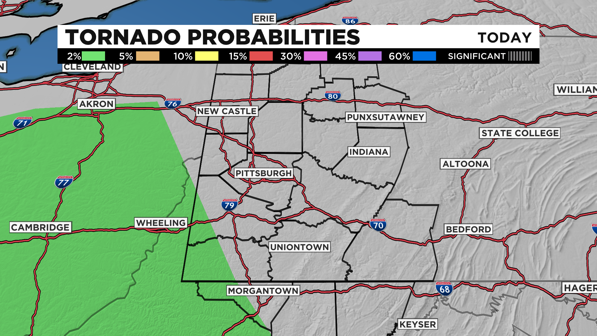 While the chance is far lower, Morgantown and Wheeling along with parts of Greene and Washington counties are included under the risk of tornadoes.