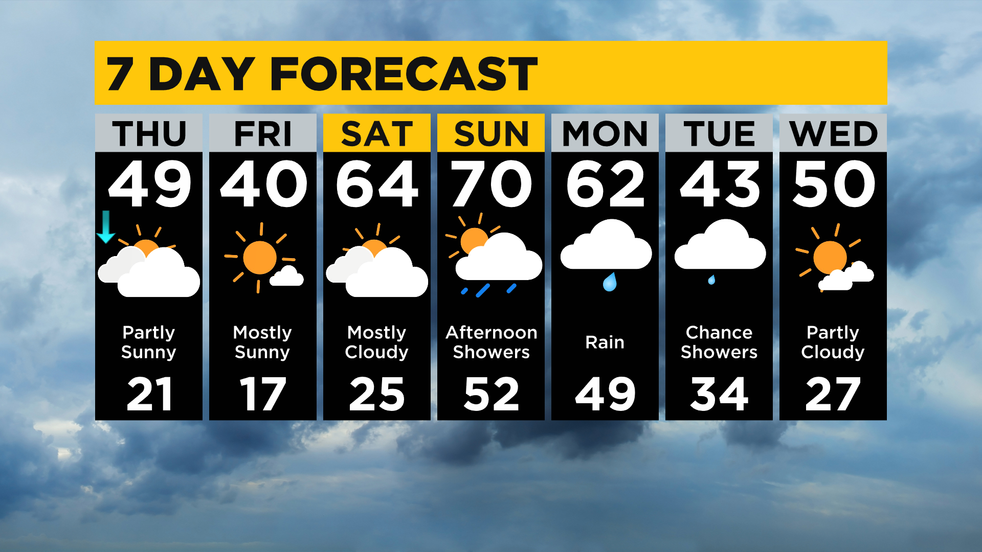 Friday highs will also be near 40 degrees. Saturday morning will also be a chilly start with temperatures in the mid-20s to start the day. Saturday highs though soar to the mid-60s.