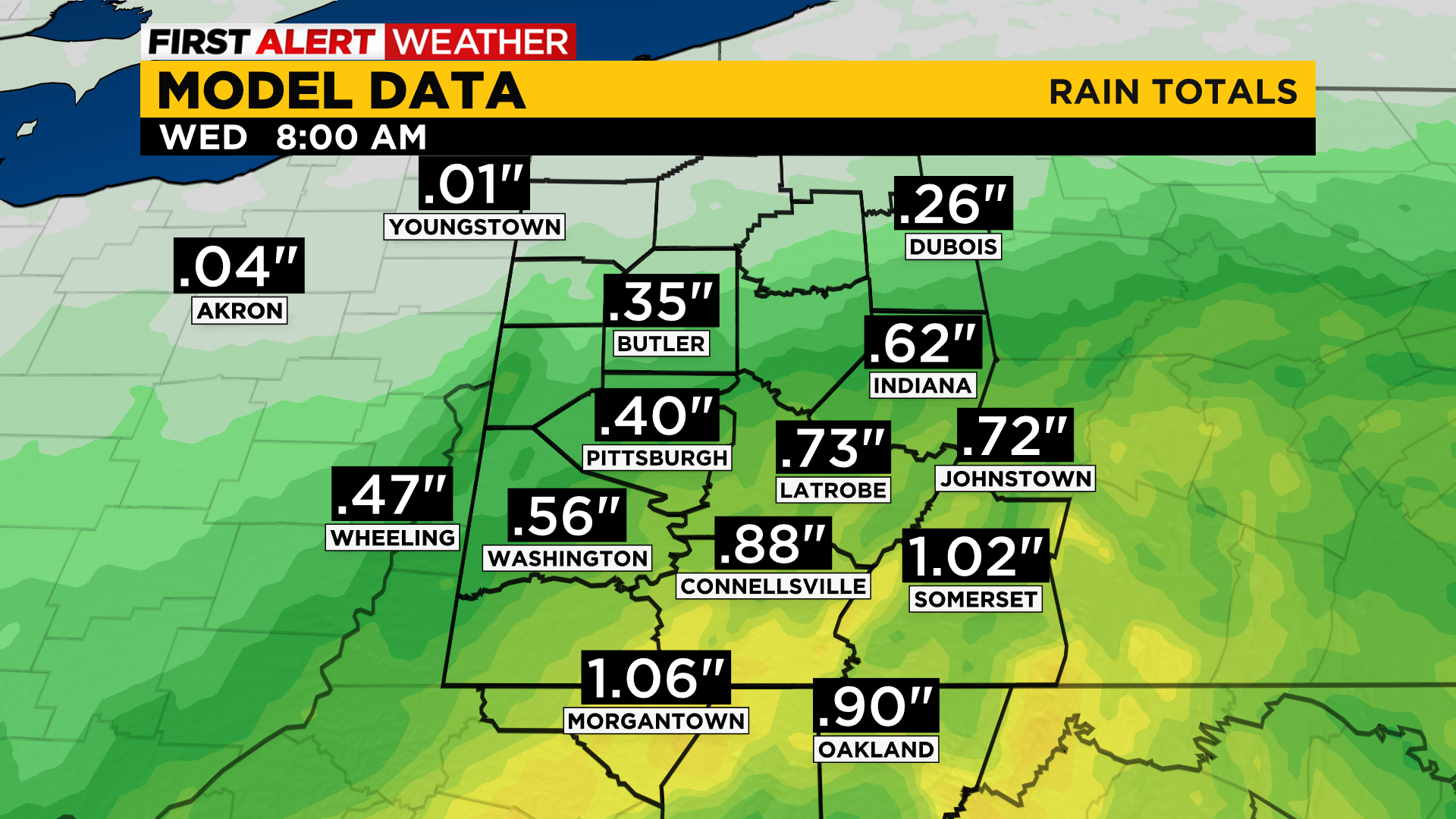 Over the next 24 hours, Pittsburgh should expect to see anywhere from a quarter-inch to a half- inch. The Laurel Highlands though should be expecting to see rain totals near an inch. The further to the southwest you are located here in Western Pennsylvania, the better chance for seeing more rain with the core of the system remaining just southwest of us.