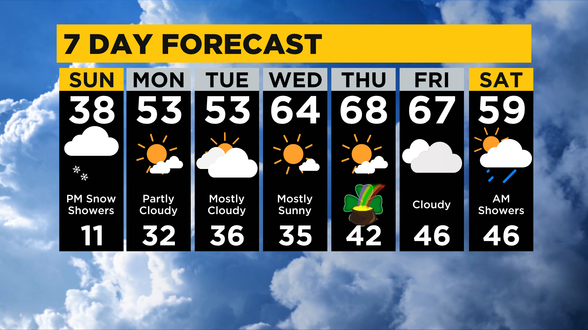 It gets better each day this week and we get to the 60s for St. Patrick's day with mostly sunny skies! We are also flirting with the 70s ending the work week.