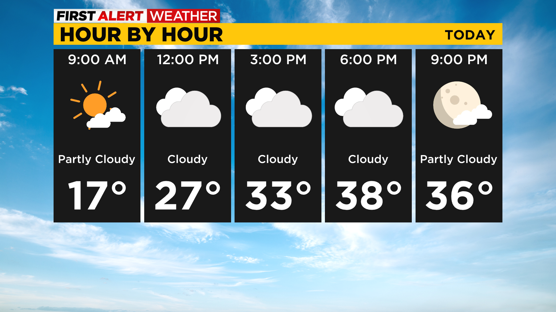 Highs today will be in the mid to upper 30s with mostly cloudy skies.