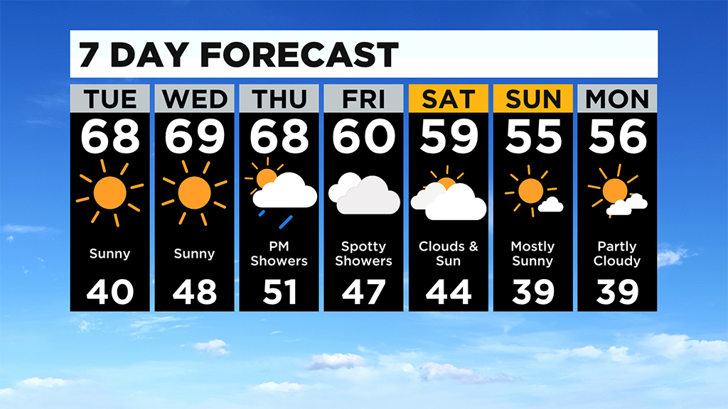 High pressure will keep us nice and dry today with plenty of sunshine. Highs will get above normal in the upper 60s.