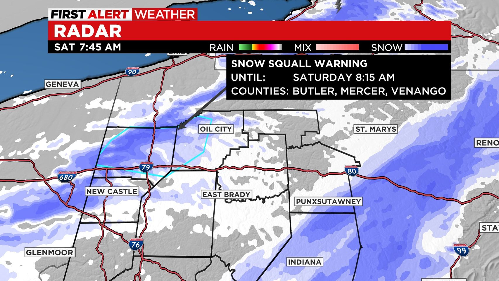 It will stay in effect until 8:45 a.m. for east-central Mercer County, Venango County, northeastern Butler County, northwestern Armstrong County and northwestern Clarion County, according to NWS Pittsburgh.