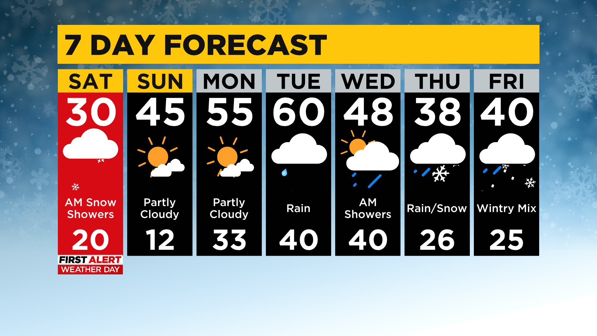 Wednesday dries out and mild weather sticks around with highs in the 50s before a chance for snow showers arrive Thursday which could potentially be a First Alert Day!