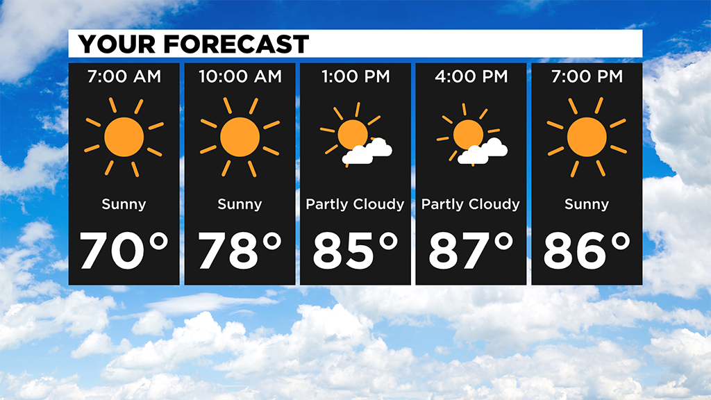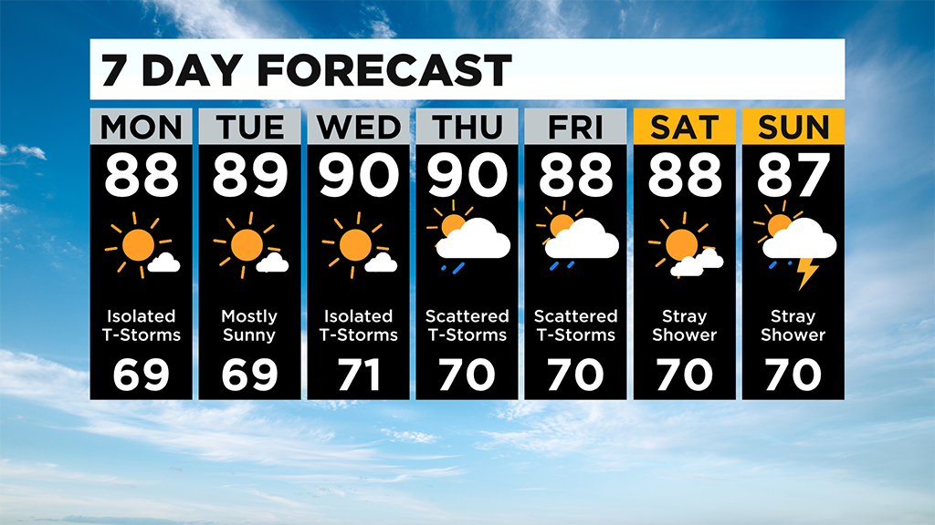 We should make it near 90 degrees and again, with the summer heat and humidity there's a small chance for an isolated shower or storm.