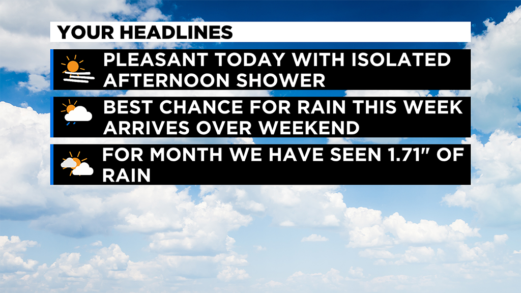 Looking ahead, our next good chance for rain arrives this weekend with scattered storms Friday afternoon and all day light rain expected on Saturday.