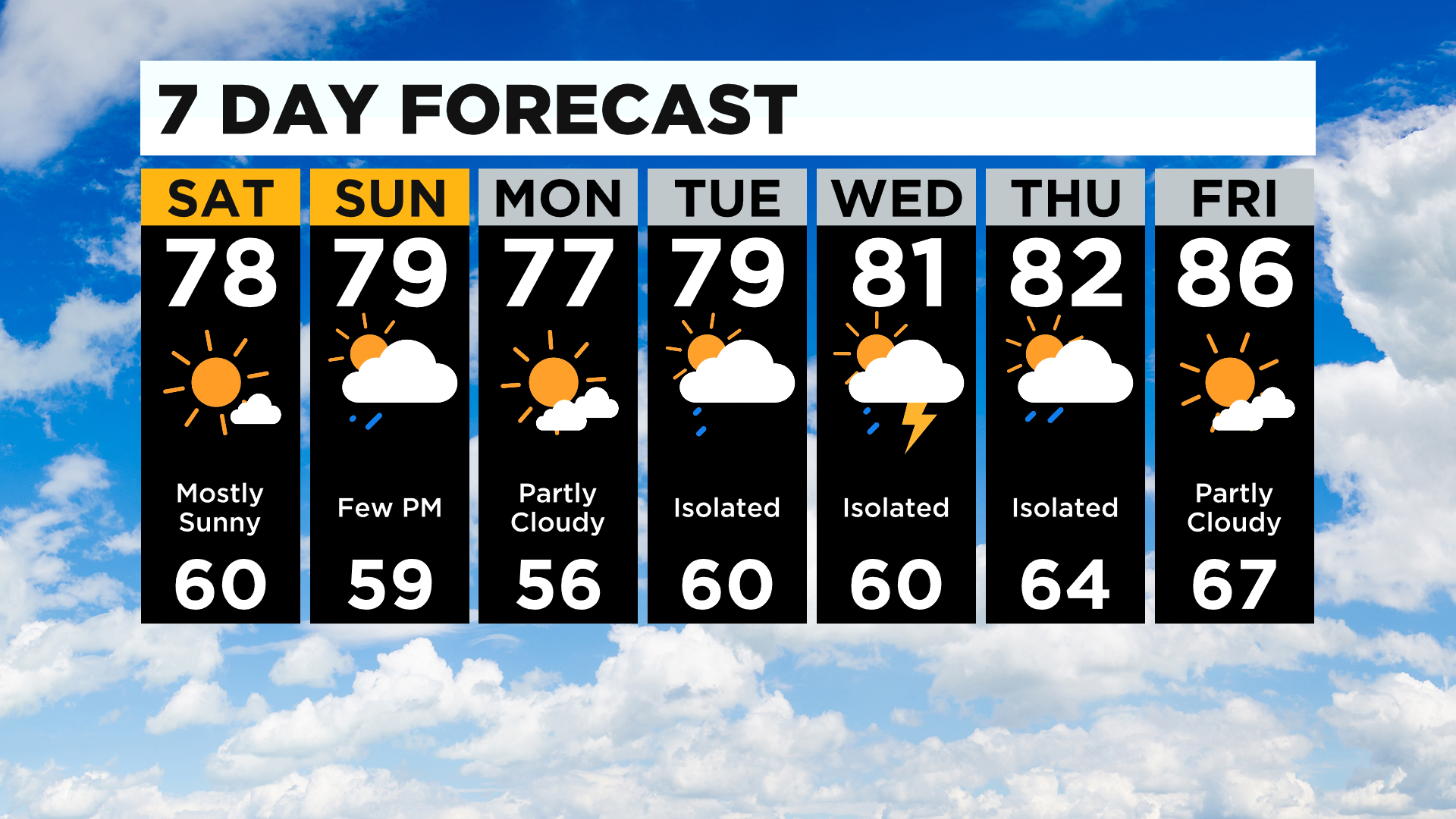 Tuesday through Thursday will have some isolated rain and storms chances.