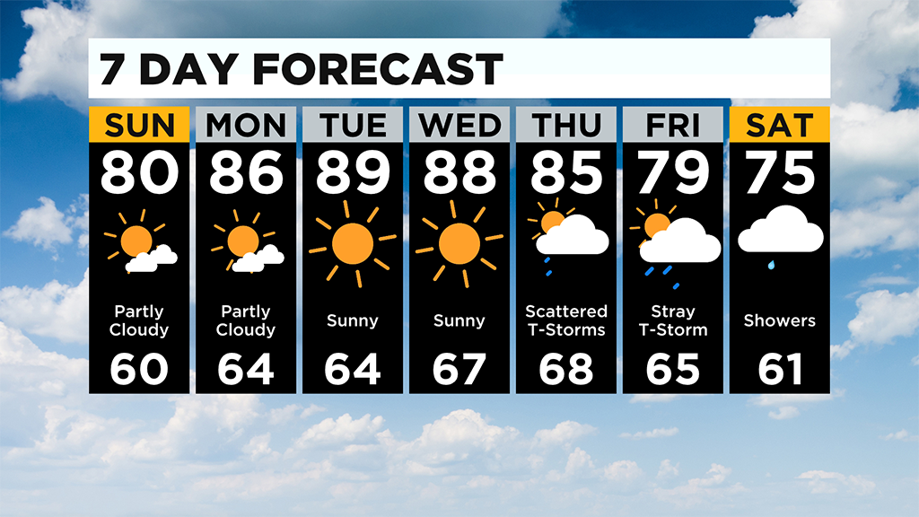 We stay dry and sunny all the way until Thursday where a few showers are possible and even a thunderstorm.