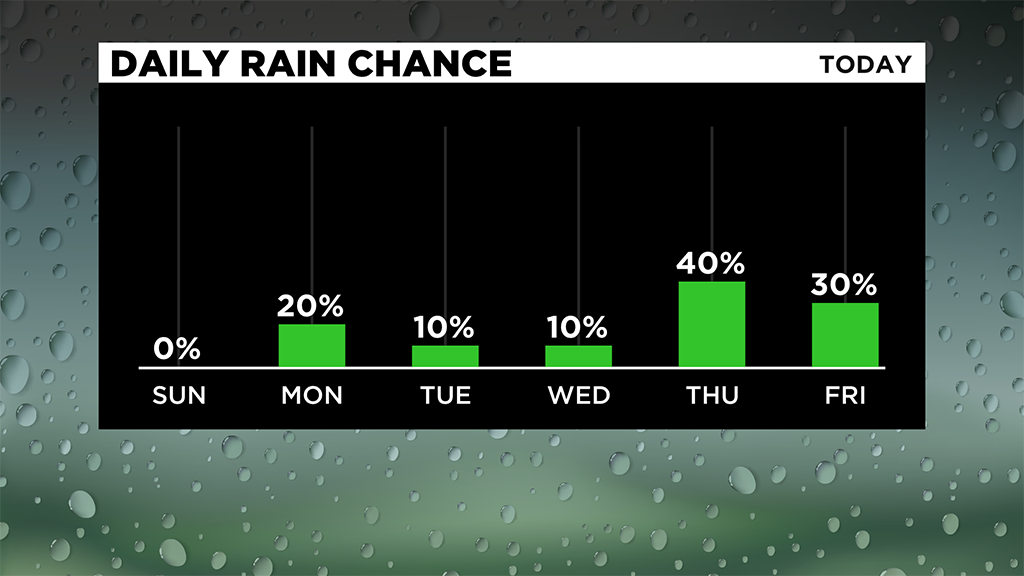 There's a very small chance on Monday later afternoon and evening that a few spots north could get a stray shower but many will stay dry.