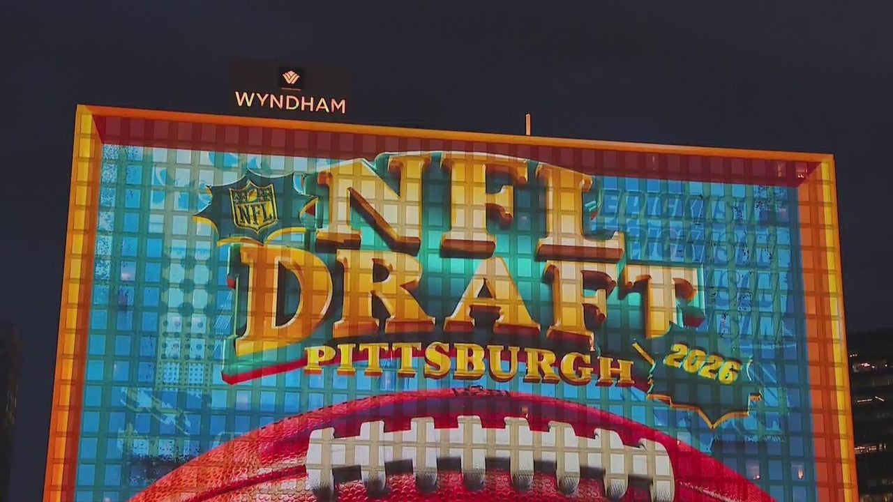 A massive light projection on the Wyndham Grand Pittsburgh pays tribute to Pittsburgh's football legacy. It will be on during the 2026 NFL draft.
