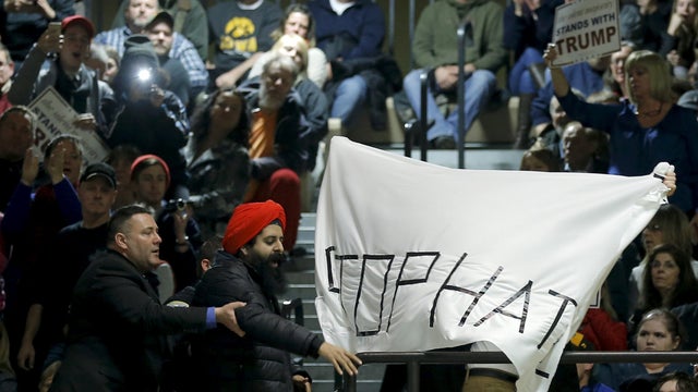 "He wasn't wearing one of those hats, was he?" Trump asked on stage after disturbance