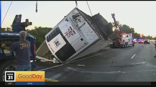 A big rig carrying eggs overturned on Business 80 in Sacramento Thursday morning, creating a traffic delay for morning commuters.